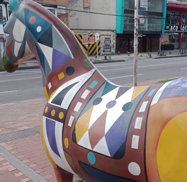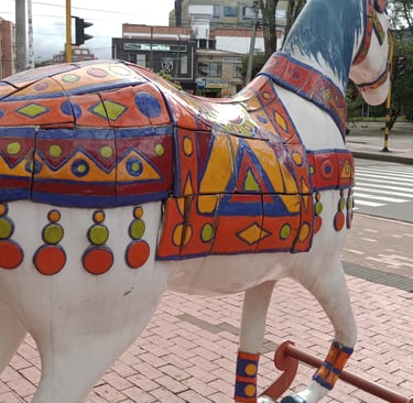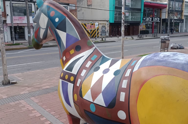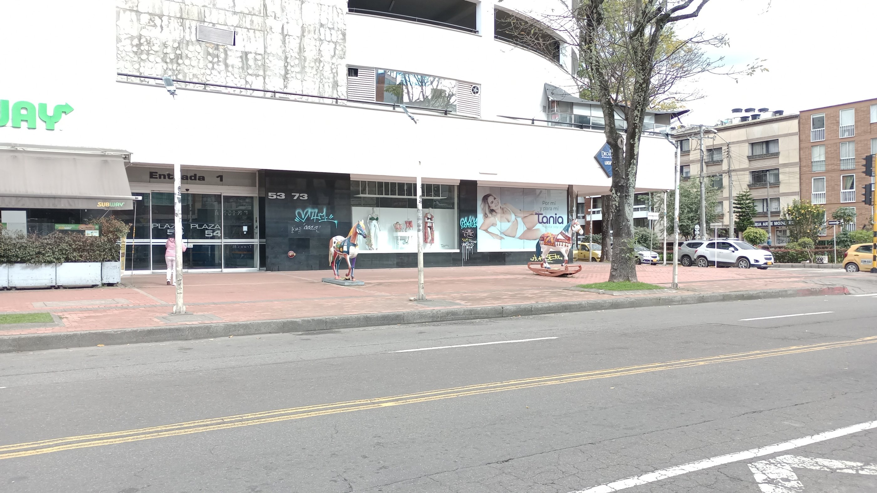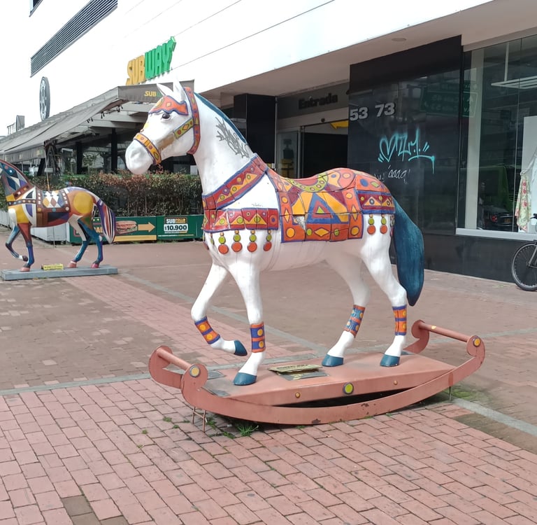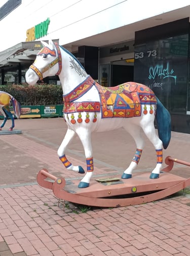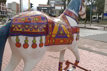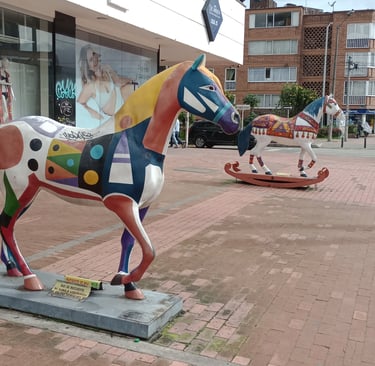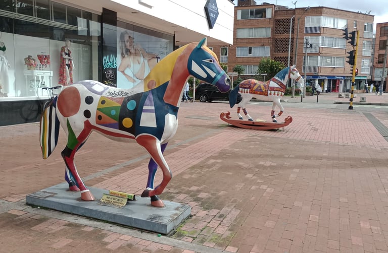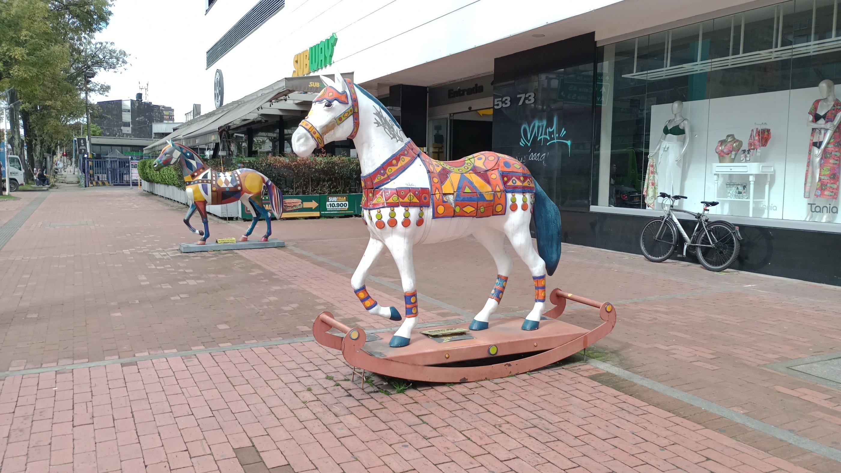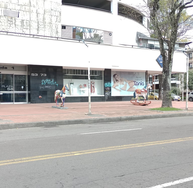 Esculturas «E. Ludicus» y «Cabalgando al sol», de la serie Equus Arte. Frente a la entrada del CC Plaza 54, Bogotá.